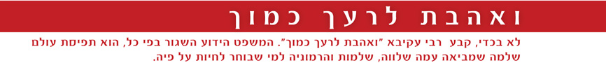 לא בכדי, אמר רבי עקיבא "ואהבת לרעך כמוך". המשפט הידוע השגור בפי כל, הוא תפיסת עולם שלמה שמביאה עמה שלווה, שלמות והרמוניה למי שבוחר לחיות על פיה. |