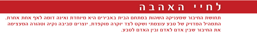 תחושת החיבור שמעניקה השהות במתחם הבית באבירים היא מיוחדת ואינה דומה לאף אחת אחרת. התמהיל המדויק של טבע עוצמתי ושקט לצד יוקרה מוקפדת, יוצרים סביבה נקיה וטהורה המעצימה את החיבור שבין אדם לאדם ובין האדם לטבע. בתנאי השקט והשלווה הללו ניתן להבחין בעוצמות החיבור נשזרות וקושרות איש לזוגתו ואת שניהם לטבע הפראי העוטף את הבועה השלווה שנוצרה סביבם. האיזון העדין שבין טבע לעיצוב יוקרתי, בין גורמה מתוחכם קרוב לתוצרת האדמה המקומית, מאפשרים לשמר את החיבור המיוחד שנוצר ולאפשר לחוות אותו במלואו. יש בו בחיבור הזה קרבה, חום, כבוד וחמלה ושם נוצרת ומשתבחת האהבה. |